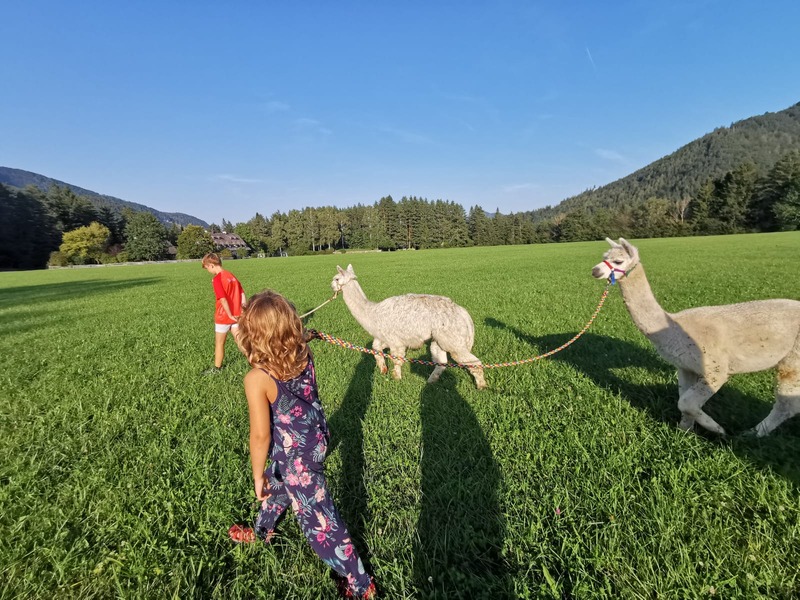Mit Alpakas spazieren zu gehen, ist ein besonderes Erlebnis für Jung und Alt. Die sensiblen Tiere helfen uns dabei zur Ruhe zu kommen und die Schönheit der Natur wahrzunehmen. Da sie in ihrem selbstbestimmten Tempo gehen, lässt sich die Dauer nicht genau vorhersagen. Meistens brauchen wir für unsere Runde über den Grillenbühel – mit Blick auf Gippel, Hofalm und Göller – ungefähr eine Stunde.